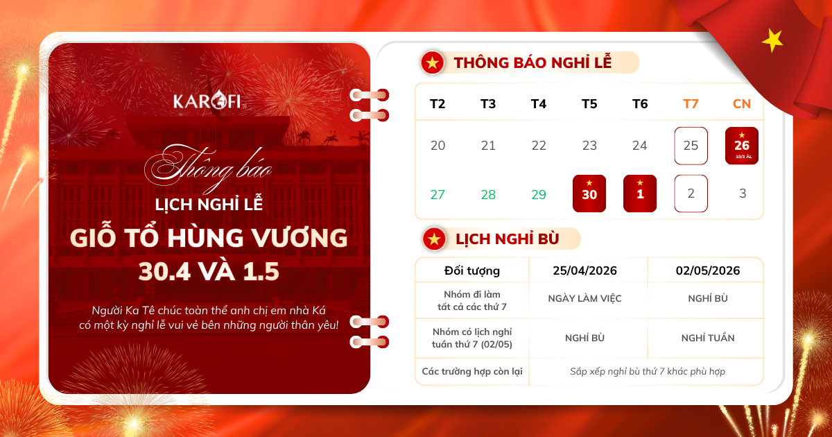 [Thông báo] Lịch nghỉ lễ Giỗ Tổ Hùng Vương (10/3 Âm lịch), Giải phóng miền Nam (30/4) và Quốc tế Lao động (1/5)